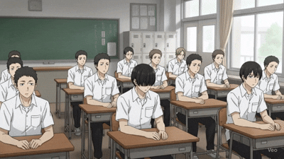 애니메이션 스타일: 각 인물들의 개성을 살리면서도 사실적인 교실 풍경을 묘사한 2D 애니메이션 스타일(일본 애니메이션풍)입니다.